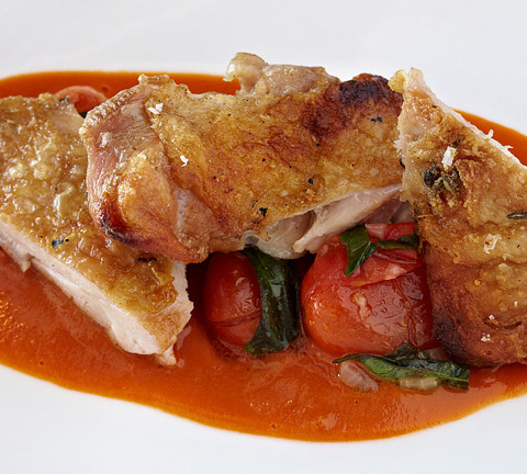 Chef Mike Isabella’s chicken thighs are a signature dish at Graffiato. Seared skinned side down and finished in the wood oven, the meat is tender while the skin is crispy. But this dish’s secret weapon is the pepperoni sauce that has made the Top Chef famous. The most apt expression to describe this puree of tomatoes, chilies, and pepperoni is “Oh my God.” Check out the recipe for the pepperoni sauce to the right.