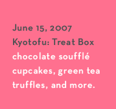 Click on “comment” below to enter an answer. Make sure to click on “submit” after the preview appears on screen! Send in your comment by 5pm today and you will automatically be entered into the drawing to win a Treat Box from Kyotofu, including chocolate soufflé cupcakes, mini miso chokos, green tea truffles, and assorted okara cookies.