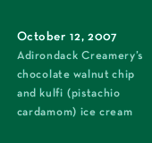 Adirondack Creamery, a new comer that produces premium ice cream made from hormone-free milk and cream from local family farms, has recently caught our attention. Our current cravings include two distinctive flavors: kulfi (pistachio cardamom) and chocolate walnut chip. The kulfi is really light and subtle, which is nice, as the cardamom doesn’t overpower. The chocolate walnut chip may sound ordinary but I don’t see anyone else out there making this combination of flavor that works so well together. So this week, we are giving two winners a pint each of our favorite Adirondack flavors.