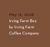 Irving Farm Coffee Company is a lovely purveyor of farm roasted specialty coffees. While the roasting facilities are located in the Hudson Valley, they have three cafés (two in the City and one in Millerton, NY), including the newest one of 7th Avenue between 13th and 14th Street that was just voted Best new coffeehouse by Time Out New York Eat Out Awards 2008. They are also building a new factory upstate and hope to get a state grant to use solar and wind power to help with their power needs. We commend Irving Farm for seeking alternative energy means!