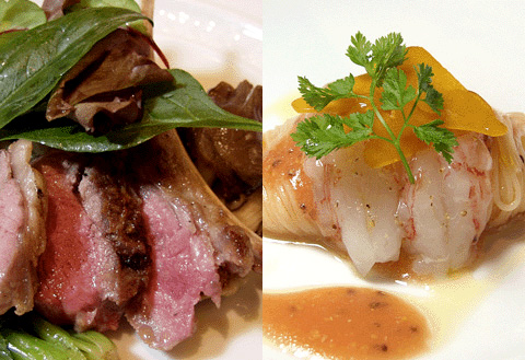 The restaurant, which only serves prix-fixe menus, is open for lunch and dinner. For dinner, there are two tiers, a six-course Canoviano special menu for NT$ 1880 (~ $59) or a seven-course chef’s choice menu, which incorporates higher quality ingredients, for NT$ 2880 (~ $90). The menu changes daily based on season and the chefs’ day-to-day acquisitions at local markets. But there are some signature staples, such as the raw shrimp, bottarga and tomato sauce cappellini (photo above right).