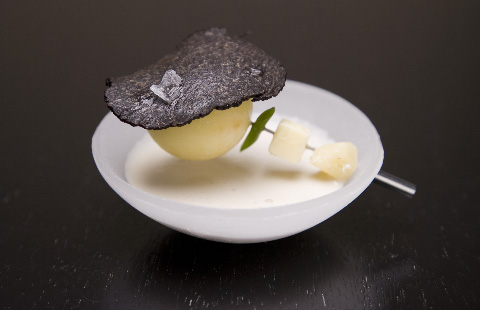 One of the most interesting dishes was apple cider encapsulated in a cinnamon shell. The sphere, made by dipping frozen cider in cinnamon-infused cocoa butter, sat in a glass of walnut milk. I was asked to drink it in one gulp but to pay attention to the fact that the sphere looked smaller in the glass than it actually was. Once the sphere broke open in my mouth, the cider and cocoa butter mixed with the walnut milk to create a burst of refreshing and wonderfully combined flavors.