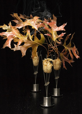 A “frozen pumpkin pie” made a grandiose entrance as the finale to the meal. The frozen filling encrusts a brown sugar pâte de fruits center and is then deep-fried tempura style. It was served in specially designed pronged setting pieces (see photo above). Smoldered leaves were attached to the “pie”, so the branch acts as your utensil as you pick it up to eat the pie. I couldn’t think of a more dramatic or more delicious way to end the meal. I was in awe! My senses had been challenged and though I was full, I craved more.