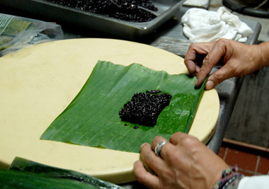 Demonstrating a dish that uses coconut milk, he made a special suman (steamed rice cake) with purple diket (glutinous) rice from the rice terraces of the Philippines. The rice is heirloom (grain passed down from one generation to another) and is grown organically and purchased at fair trade prices.