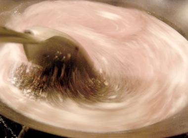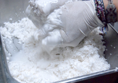Perry first heated the fresh-squeezed coconut milk in a large wok, and then added the drained heirloom rice. He cooks until the coconut milk is completely absorbed and evaporated. The only other ingredient is coarse sea salt from the Philippines.