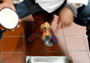 Coconuts are available at the West Indian grocery stores in Brooklyn. Here we see mature coconuts. Perry uses a knife to shave off the hair.