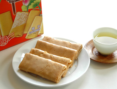 These egg rolls are thin crepes rolled with coconut shreds between the layers. Baked, the texture is like a cookie, and the crisp fine layers make each bite delectable. I find that refrigerating the rolls and eating them cold makes them even taste even better!