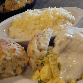 Brunch at The Porter’s Beer House, a gastropub in Little Five Points in Atlanta, was some kind of wonderful. Here’s a shot of Stu’s biscuits n’ gravy: chicken sausage gravy, scrambled eggs, cheese grits, and the most amazing Cheddar chive biscuits!