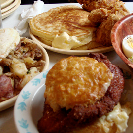 Since Pies ‘N’ Thighs reopened in its new location as a real sit down restaurant, the menu has also expanded. All of it is comforting. Here we are having a feast of chicken biscuit, fried chicken and pancakes, corned beef hash with egg, and a glimpse of the big salad — which is also delicious!