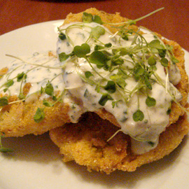 The other day at The Redhead for brunch, I noticed the party next to me enjoying their entrées. What jumped out at me wasn’t the steak or eggs, but rather the fried green tomatoes that came on the side. I promptly asked for a side order of the buttermilk and microgreens dressed cornmeal-crusted fried green tomatoes. The fried green tomatoes, the crab and leek tart and the chicken and waffle made the perfect comfort brunch!