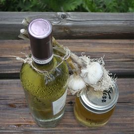 here’s the bottle of white wine, garlic bunch and homemade meyer’s limoncello seen from the top.