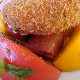 Hawaii’s big on tomatoes and produce a lot of it. Plump and lush, they are flavorful. Seen here with a fried goat cheese medallion at the Royal Hawaiian Surf Lanai restaurant.