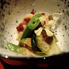 Kajitsu just turned one. Happy birthday! On the menu this month is this starter of okara with carrot, onion and beets, Brussels sprouts with Japanese butterbur sauce, and fresh sugar snap peas. As always, the presentation is as appetizing as the cuisine!