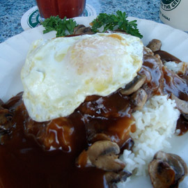 Loco Moco is a local favorite in Hawaii that consists of white rice topped with a hamburger patty, fried egg and brown gravy. I requested mushrooms in the gravy at Joe’s On the Green in Kauai for breakfast one morning. Very tasty and paired perfectly with a Bloody Mary!
