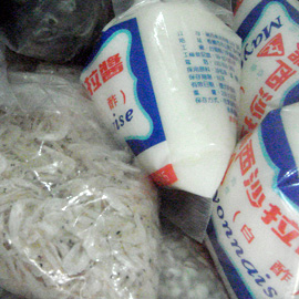 In my neighborhood grocer in Taipei, I found two condiments in a bin together in the fridge: dried shrimp and mayonnaise. The two are unlikely bed fellows, but I guess since they are both condiments, it makes sense.