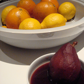 An interior designer uncle of mine is also an amazing chef who use to own his own restaurant. At his house, everything is a pleasure to look. Here are the poached pears for dessert, soaking in red wine, sitting beautifully in front of a bowl of citrus fruits.