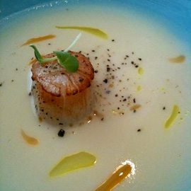 Barn Canteen is a new modern Western restaurant in Taipei. Here’s the ridged gourd cream soup with scallop. Love the contrast of the blue bowl, cream soup and the yellow and oranges of the oils.