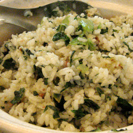 In addition to white rice, a Shanghainese staple is vegetable rice — rice cooked with green vegetables and ham or sausage to add aroma and flavor. At Rong Rong Yuan in Taipei, vegetable rice, cooked in a clay pot, runs out early.