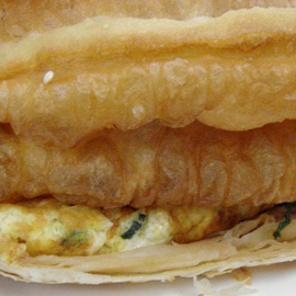 Here’s the combination of Chinese flat bread, fried dough and scrambled egg. Yummy breakfast!