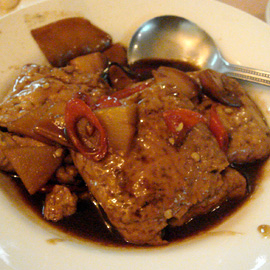 I’m sure you’ve heard about if not tasted stinky tofu. I live for stinky tofu. When I was a kid, my dad used to order it daily from the street vendor who passed by his office, and had him deliver to me at home. Street vendors in Taiwan tend to sell stinky tofu deep-fried, but at Shanghainese restaurants, like Rong Rong Yuan, they are steamed and cooked with sauce. Stinky, stinky! I love it.