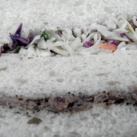 Breakfast this morning: tuna sandwich! The tuna is mixed with black sesame and crushed peanuts, giving it great flavor and texture, and the cole slaw in this double-decker sandwich is refreshing.