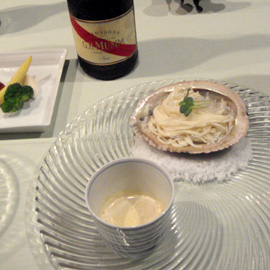 Uni Somen (sea urchin noodles) and Champagne Blindfolded
