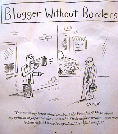 Today, Adam Kuban of Serious Eats sent me a link to his Flickr posting of a cartoon, Blogger Without Borders, from the Feb. 19 & 26, 2007 New Yorker. We had a good chuckle over it. Adam may be an earnest blogger but I love the fact that he’s got a great sense of humor and doesn’t take himself too seriously. Everyone’s a critic these days and has something to say, but we need to remember the basic boundaries of respect and common courtesy and not just spew for the sake of spewing. Blogging has made great contributions in this information-obsessed age, but it’s important to keep to an objective, and most of all, remember that it’s fun!