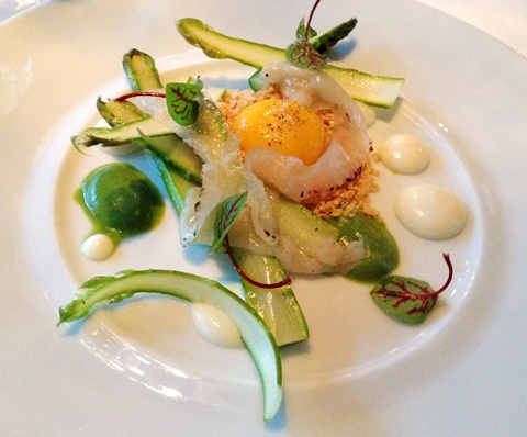 Sitting inside this tiny, second-floor Midtown restaurant, adorned with glass bauble chandeliers and pastel Russian paintings, feels a little like nesting inside a Fabergé egg. Chef Christopher Agnew’s cooking is jewel-like and precise — echoing both his surroundings and previous stints at three Alain Ducasse establishments. This lovely dish features blades of both cooked and raw asparagus, which criss-cross the plate and frame a bed of aged Parmesan that’s been grated and slow-baked in the oven until its flavors ripen and blossom. Atop that is a soft egg yolk poached in olive oil and festooned with ribbons of warm lardo. Dotting the plate like minor jewels to offset the yellow diamond yolk are sorrel leaves and alternating orbs of vivid green asparagus purée and pure white crème fraiche.