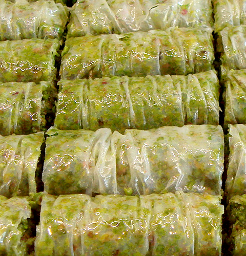 The brand new Midtown branch of Gulluoglu, the famous Istanbul bakery and café, is attracting a lot of attention with its signature baklava in all 12 varieties. Since it opened a month ago, there’s been a steady stream of traffic both for dining in and take-out. The baklava are showcased up front by the register, the savory pastries at the back counter, and the seating runs the length of the café between the two. I’m a savory girl, so I love all the meat, cheese and spinach rolls and pies. And the simit! At last there’s an accessible Manhattan bakery that sells the ring of sesame-seed topped bread that I fell in love with in