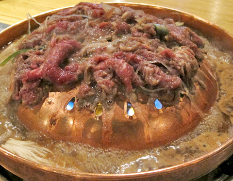 While it’s listed on the menu simply as “bulgogi,” this is different from the familiar thinly sliced, marinated, and grilled sirloin style of bulgogi. Palace Style bulgogi, which has become increasingly popular at restaurants, supposedly originated from the Korean royal palace. Instead of being grilled, the meat is cooked — in its own marinade, juices and broth along with clear noodles — at the table in a special copper ring pot, which results in very tender meat. I find the flavor of the broth and meat to be unexpectedly light and sweet. Because it’s less greasy than most barbecue choices, this could be a nice change of pace for many people. I like to pour the brothy dish over rice, mix and eat.