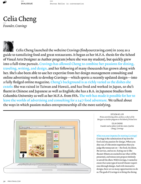 The summer food issue (August 2009) of Print is now on newsstands. Cravings was featured in this issue’s “Dialogue”, in which Steven Heller and I chat about Cravings and a little food porn. I was surprised to find myself saying the following but it came so naturally: “I often find my descriptions of dining experiences to be rather sexual — not in an explicit way, but just enough to titillate.” What can I say? We’re so excited!