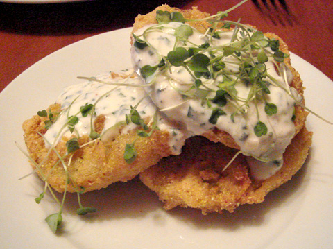The other day at The Redhead for brunch, I noticed the party next to me enjoying their entrĂ©es. What jumped out at me wasn’t the steak or eggs, but rather the fried green tomatoes that came on the side. I promptly asked for a side order of the buttermilk and microgreens dressed cornmeal-crusted fried green tomatoes. The fried green tomatoes, the