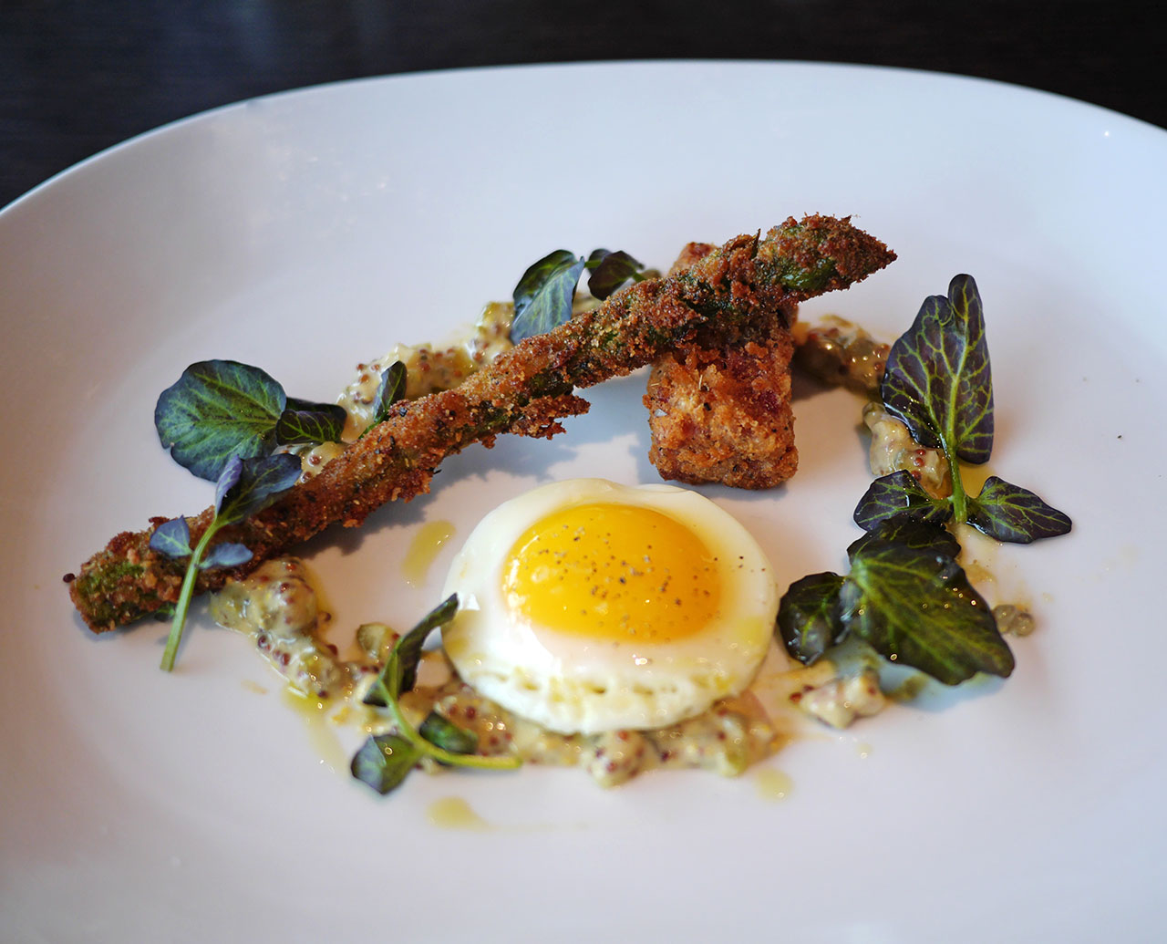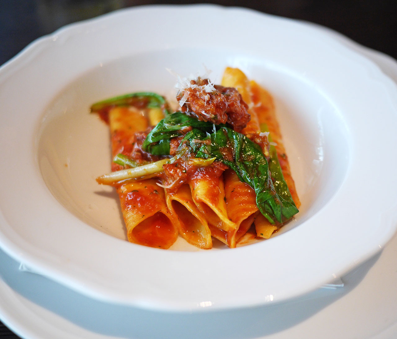 Next came a pork terrine with crispy green asparagus, sunny-side-up egg and watercress, encircled by a ring of mustard vinaigrette. Both the asparagus and terrine — cut into cubes — were breaded and deep fried, the terrine bringing to mind the best haute corn dog you’ve ever had, and the bracing vinaigrette cutting its richness. The final appearance of Lincoln’s house-made charcuterie was in a dish of house-made garganelli pasta that comes bathed in a spicy marinara sauce studded with pork sausage and Calabrian chilis. Dusted with shavings of smoked caciocavallo cheese (that gourd-shaped stretched curd cheese you see hanging in Italian delis), our pasta came topped with an extra treat, the first sweet ramps of the season, grilled.