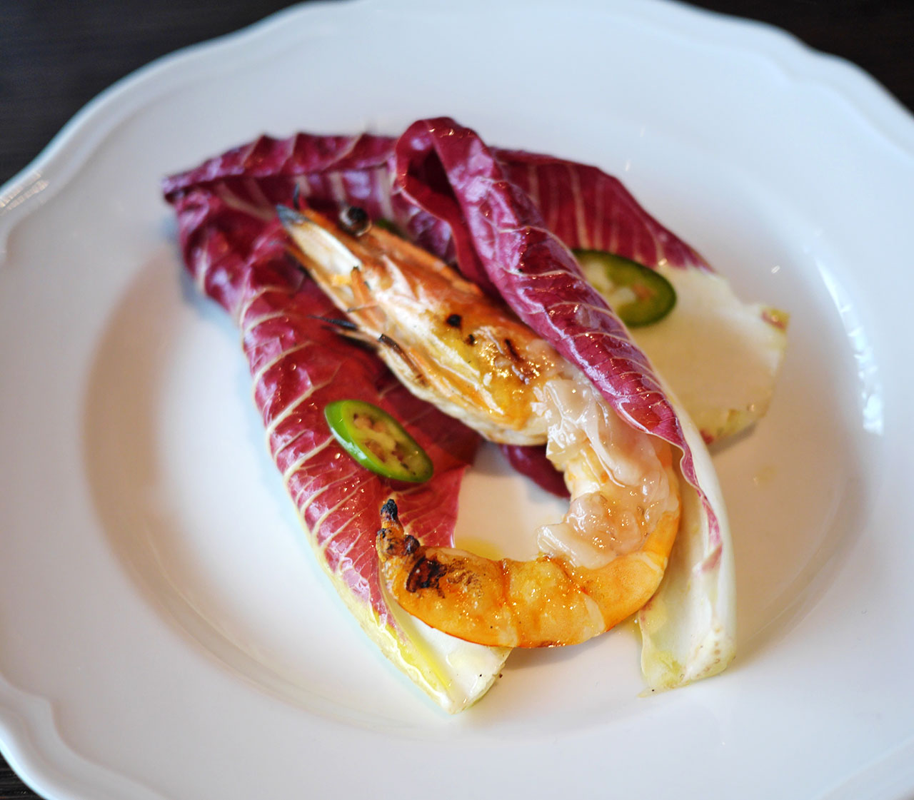 Every week, Lincoln Ristorante chef Jonathan Benno receives a whole pig from his supplier, Vermont Quality Meats. He prefers heritage Durocs for their “great meat-to-fat ratio and exceptional flavor.” Broken down, the animal provides everything from loin chops to testa, and brings a robust Italian earthiness to the menu. We were fortunate to catch Benno’s just-unveiled spring menu, featuring three delicious and jewel-like preparations. The first and our favorite was a single perfectly grilled prawn, nestled in a bed of deep magenta-colored radicchio, lovingly wrapped in paper-thin, meltingly delicious lardo (cured pork fatback) and dressed lightly with Meyer lemon and Serrano peppers. Benno has devised a way to both allay food safety concerns and speed the lardo-making process without sacrificing an iota of flavor. Normally a months-long process that involves packing the fat in salt, rosemary and other aromatics, he instead Cryovacs the mixture and steams it overnight.
