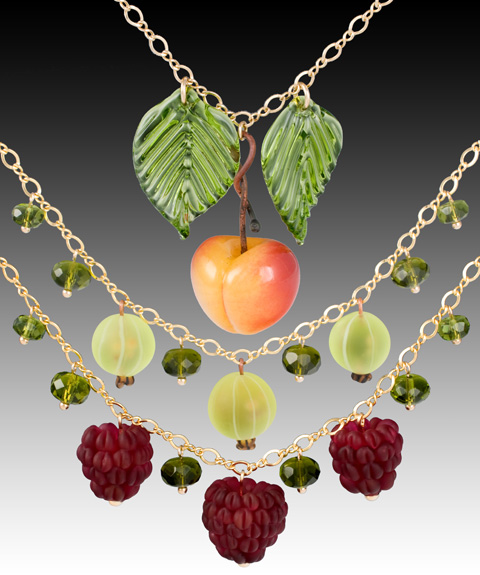 I first stumbled upon Elizabeth Johnson’s exquisite glass berries at the RAS Gallery in Yountville, California. The sculptural equivalent of photorealist paintings, they project a sense of high-gloss, heightened realism; you note both the natural beauty of the objects they are based on and the artifice behind these trompe l’oeil imitations. The Colorado-based artist uses a combination of flameworking (sculpting molten glass in the flame of a 4,000-degree Fahrenheit oxygen-propane torch) for her fruits and leaves and pâte de verre (using molds and powdered glass) for the occasional fruit tart shell or glass cake. In addition to the life-size sculptures, Johnson also makes beads and jewelry using the same motifs. For your crafty friends, perhaps a box of beads as inspirational building blocks for her or his own jewelry making will be the perfect gift; for those who like their gifts ready-to-wear, try one of these cherry, gooseberry or raspberry necklaces.