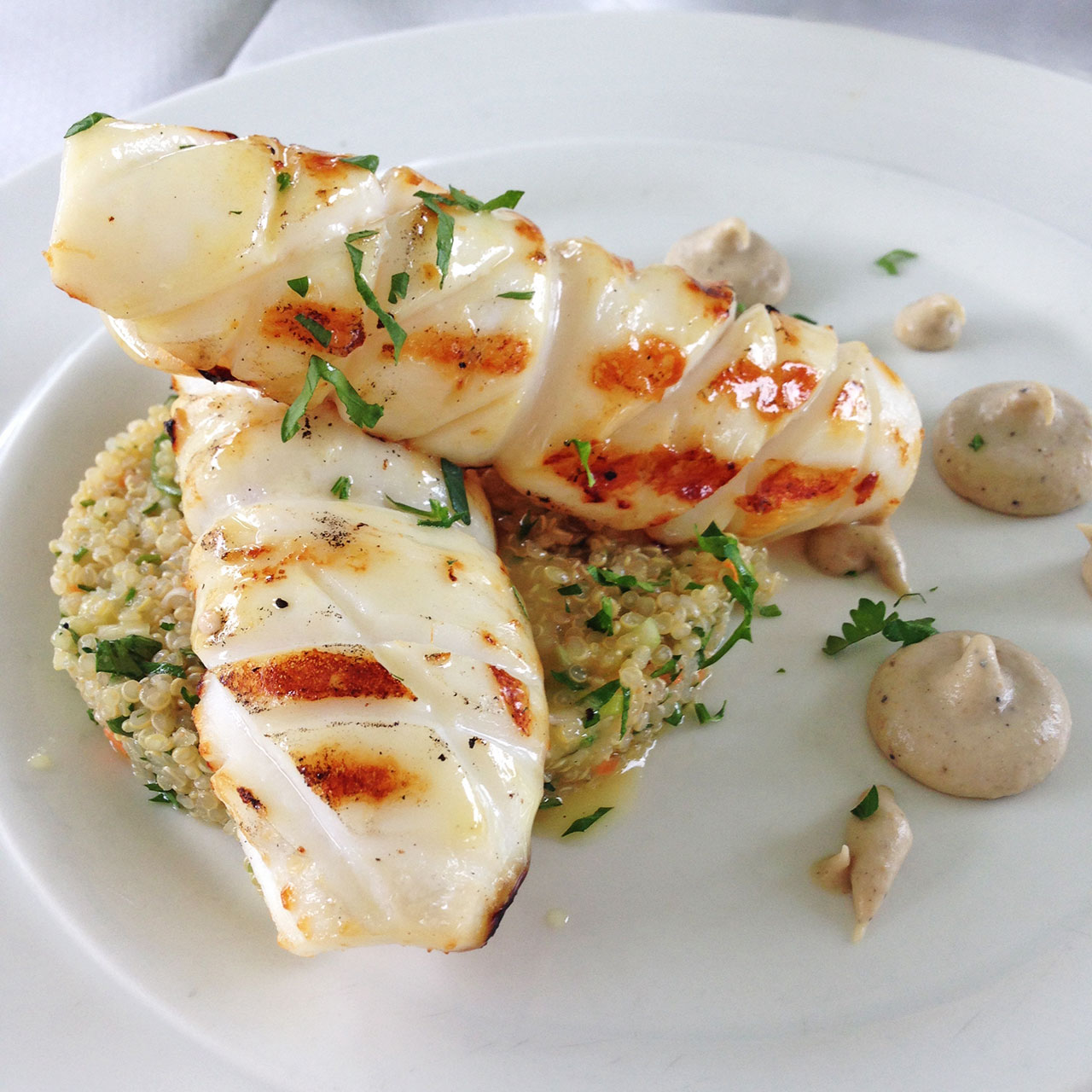 Santorini is known for its cherry tomatoes, capers, white eggplants, fava beans and seafood. At Nichteri, chef Vassilis Zacharakis showcases these fresh local flavors. The grilled squid is just one example, with the calamari served atop a bed of quinoa accented by white eggplant purée on the plate. Nothing beats the flavors of simple fresh ingredients. The restaurant is on the black sandy beachfront of Kamari.