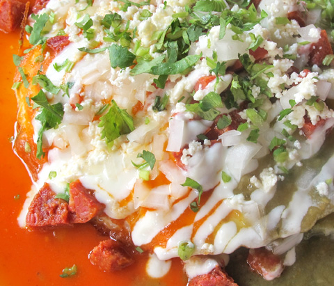 Brunch at Fonda is a fantastic deal: for $12 or less, you get a copious brunch entrée and a rosalita, Fonda Bloody Mery or mimosa to drink. But I wouldn’t recommend Fonda just because it’s a deal. I think the huevos divorciados is a steal: a dish not only beautiful in presentation but also with immense depth of flavors. Two sunny-side up eggs sit atop a crispy homemade corn tortilla and are covered in both salsa verde and ranchera sauces — “Christmas,” as they say of green and red sauce pairings in New Mexico. I love the slightly piquant flavors of the salsa verde, made from a blend of tomatillos, garlic, onions and cilantro. The contrasting red ranchera sauce contributes a sweeter and slightly spicier tone of roasted tomatoes, garlic, chipotle and habanero peppers and Mexican cinnamon. The “divorced eggs” also include black beans, bacon (you can substitute chorizo, as seen in photo above), queso fresco and crema, served with a side of rice and beans. See, I meant it when I said it’s a steal!