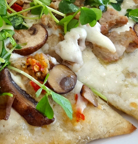 Stepping into this bright, airy restaurant within the modern wing of the Art Institute of Chicago feels like dropping in on a Mies van der Rohe-designed canteen. Actually it’s the work of architect Renzo Piano, who’s made himself into something of a museum specialist. The restaurant’s name not only references him, but also means “third floor,” where the restaurant is located in the museum (admission to which is not required to gain access to the restaurant). The all-white decor and nearly floor-to-ceiling glass windows and blond hardwood floors give the room the feel of a modernist eyrie, with vistas of Millennium Park and Michigan Avenue. The menu touts its local and sustainable values; one example is this hearty flatbread-style pizza, which sports garnishes of garlic, chili, pine nuts and delicious aged Evalon goat’s milk cheese from Wisconsin. It’s just one of many appealing inventions from star chef Tony Mantuano’s (of Spiaggia renown) kitchen.