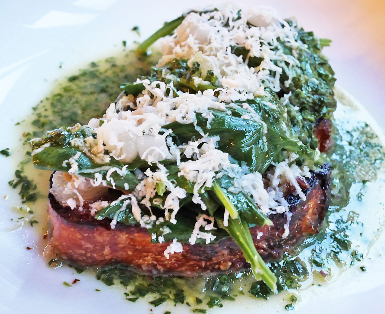 Wildair, Contra’s more casual modern bistro a few doors down on Orchard Street, has a short and delicious à la carte menu that includes this dish, which I think is a little piece of heaven. Littleneck clams, leafy sautéed Malabar spinach and lardo are piled on a toasted piece of She Wolf Bakery sourdough, soaking in a vegetable broth with clam juice and a splash of citrus. The freshly grated horseradish on top adds piquancy. She Wolf’s sourdough is hefty enough that it soaks up all of that juicy goodness while still serving as a hardy base that you can eat with your hands. The clams, spinach and lardo offer three distinct textures that taste so good together, and the tanginess of the citrus in the broth brings out a lingering brightness.