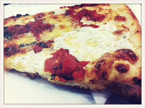 Bleecker Street Pizza’s Nonna Maria is a Tuscan thin-crust pizza with fresh mozzarella, homemade marinara sauce — made with canned whole Italian San Marzano tomatoes that will knock your socks off — Parmesan and fresh basil. Unlike regular slices that have a marinara and cheese base, this is more like a bianca with chunks of the delicious marinara sauce on top of the cheese. Bleecker Street Pizza looks like your run of the mill corner pizzeria, but the Nonna Maria is such an unexpected gourmet surprise. I love being caught off guard in this way.