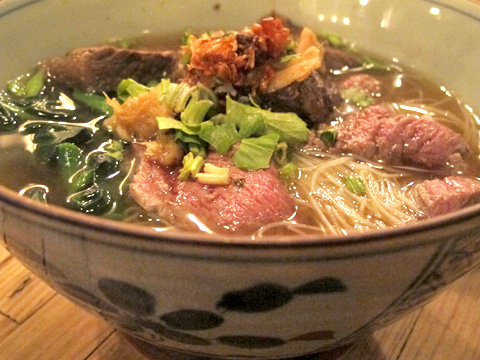 The Pa-Yao Beef Noodle Soup at Pure Thai Shophouse is a beautifully balanced dish. The protein, vegetables and starch make it a complete meal. The textures are balanced, too — the demi-crunch and bitterness of the Chinese broccoli, richness of the tender braised beef ribs (off the bone but still with the connective tissue), meatiness of the lean beef slices and lightness from the hair-thin vermicelli. Add to this the unique beef and galangal herb broth — with some of the same flavor notes as consommé — the pinch of fried garlic flakes, touch of fresh cilantro and the tart and fruity chili sauce, and what you have are strong flavors that don’t cloy because of the many complementary counterpoints. If you’re a fan of noodle soups, this dish is for you.