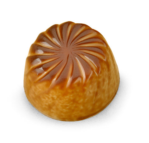 Passion fruit truffles are undoubtedly one of my favorite chocolates, and Brian McElrath’s take on them has the perfect consistency, flavor and texture. Even if you’re not a white chocolate fan, its presence in this bonbon is inconspicuous yet instrumental to the bonbon’s ultimate perfection. The white chocolate passion fruit mousse filling is smooth and light with an invigorating piquant tartness just like the real fruit, followed by a subtle hint of orange liqueur. Dark and white chocolate combine to form a thin but glossy hard couverture that snaps crisply when bitten.