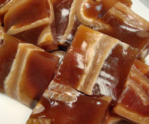 Cyn recently took me to M&T in Flushing, a Chinese restaurant that serves Qingdao cuisine. Yes, the same place that’s known for the beer, Tsingtao. Here we have a jelly of pork skins, in which the pork skins are boiled so all the juices come out, then chilled so that it congeals into jelly. It’s then cut into pieces. The pork skins are still laden throughout the jelly. Great cold starter!