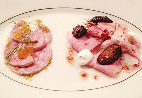 With its industrial, rough-around the edges décor, deep list of rare Italian brews and an all-embracing nose-to-tail ethic, Alla Spina is the Marc Vetri family of restaurant’s tattooed little brother. Amid a gem-studded menu that includes crab and horseradish deviled eggs and pigtails agrodolce, it is the beer and Chef Pat Szoke’s ever-changing menu of house-made charcuterie that will draw me back. You’ll always find some form of terrine, a salami and Szoke’s sublimely silky version of prosciutto cotto ham on the menu. The latter has been injected with and allowed to sit in an herb-rich brine for two weeks then poached all day. Accompaniments change seasonally. Now the proscuito cotto is paired with a shaved apple and celery root salad, dressed lightly with a mixture of whipped cream, Dijon mustard, parsley and finished with a drizzle of black walnut pesto. In the fall it stepped out with whipped ricotta and marinated figs (pictured here, along with a fennel sausage with peach mostarda and fennel seed oil). Whether you’re craving brine-smoked beef tongue pastrami or venison cotechino, Alla Spina —which also, by the way, features an adventurous drinks program — has your salumi needs covered.