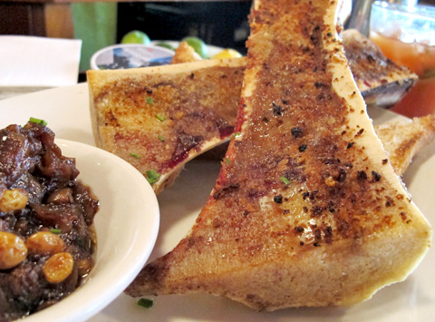Last month we took my mom to Knickerbocker for the bone marrow, a then-brand new menu item, and she is still talking about it. At Knickerbocker, the bone is split down the middle lengthwise, for easier access to the good stuff, and served with a cipollini onion and golden raisin marmalade and toast points ($12.50). It’s grouped on the menu with a few other revised dishes from famous establishments as this is an adaptation of Trattoria da Alfredo’s dish from the 60s.
