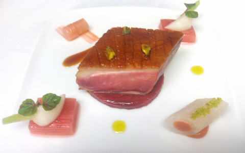 The secret to this marvel of a dish, according to Daniel’s Executive Chef Jean François Bruel, is to cook the duck breast on the bone, roasting it slowly so the meat stays moist and the skin becomes crackly and crisp. Even before that, though, Bruel starts with arguably the best farm-raised duck in the country, from Liberty Ducks of Petaluma, California. Robust and rich in flavor in a way that restores pride to the word “gamey,” generously carved slabs of the bird (more actually, than in this photo) are accompanied by delicate, gumdrop shaped, rose-colored turnips wearing jaunty berets of sweet radish. Both vegetables serve as a sweet foil to the tartness of the poached rhubarb. A rich and lightly spiced Szechuan pepper jus and a sprinkling of Sicilian pistachios complete this edible still life, destined to be short-lived.