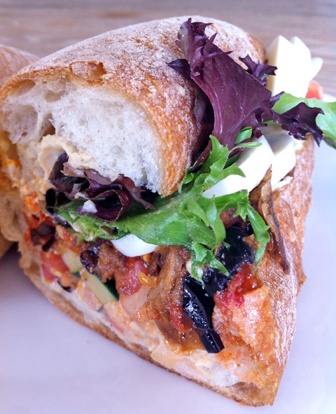 Lately, my favorite place to order lunch is the tiny sandwich shop, Bite. They have big salads with flawless organic greens, creamy hummus with crunchy pine nuts and slivered almonds and a variety of hunky sandwiches. But the number one item in my book is the sabih sandwich. The combination of hummus, hard-boiled egg, eggplant and Israeli salad stuffed in a pita is a popular Middle Eastern food, but at Bite they stuff it in Balthazar’s ciabatta bread instead. The crusty bread gives just enough texture to complement the mushiness of the sweet caramelized eggplant, creamy hummus and hard-boiled egg. But the tasty little package wouldn’t be complete without the refreshing bite of Israeli salad (chopped cucumber, tomato and onion in lemon juice) and the spicy kick of harissa paste. This sandwich is hearty, filling and oh so good!