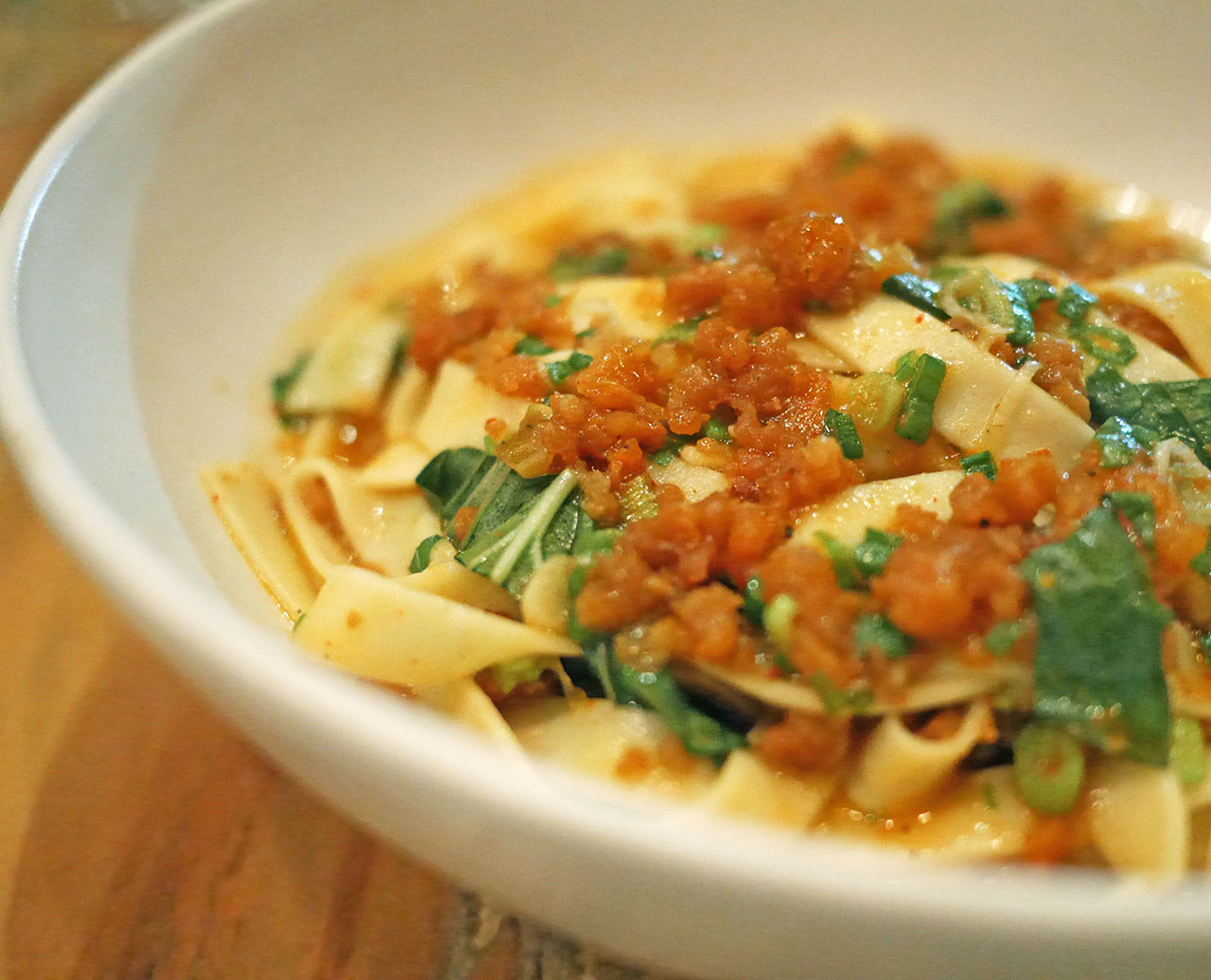 Spicy ground shrimp, flavored with curry and citrus, over fettuccini is an ingenious alternative to pasta Bolognese.