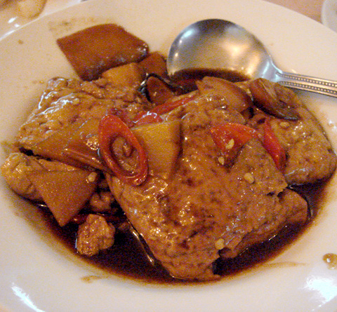 I’m sure you’ve heard about if not tasted stinky tofu. I live for stinky tofu. When I was a kid, my dad used to order it daily from the street vendor who passed by his office, and had him deliver to me at home. Street vendors in Taiwan tend to sell stinky tofu deep-fried, but at Shanghainese restaurants, like Rong Rong Yuan, they are steamed and cooked with sauce. Stinky, stinky! I love it.