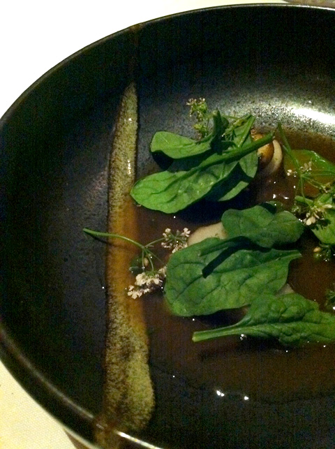 Roasted Sunchocke, Chicken Dashi, Spinach and Fermented Pepper